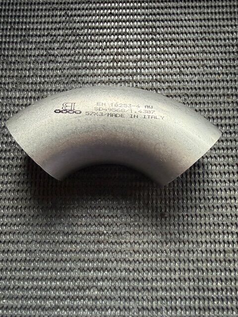 Stainless steel 90deg bend elbow in grade 304L in matt grey finish, These bends are primarily designed for the food, brewery, dairy and petrochemical industries and have a smooth bore with the weld bead rolled flat. They are available with the original manufacturers test certificates and were manufactured in Italy.